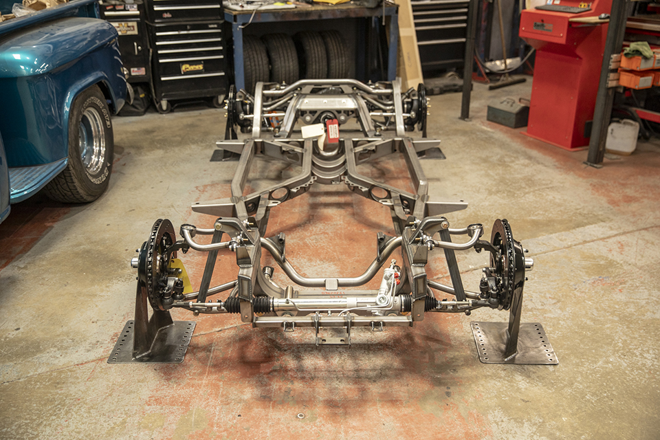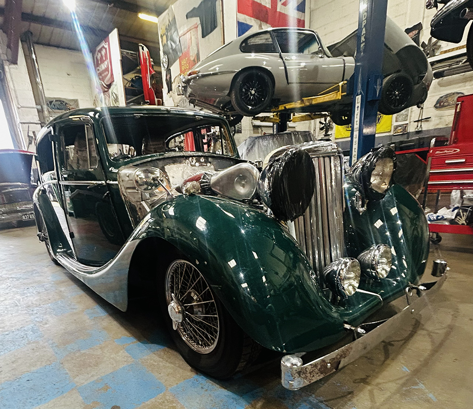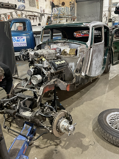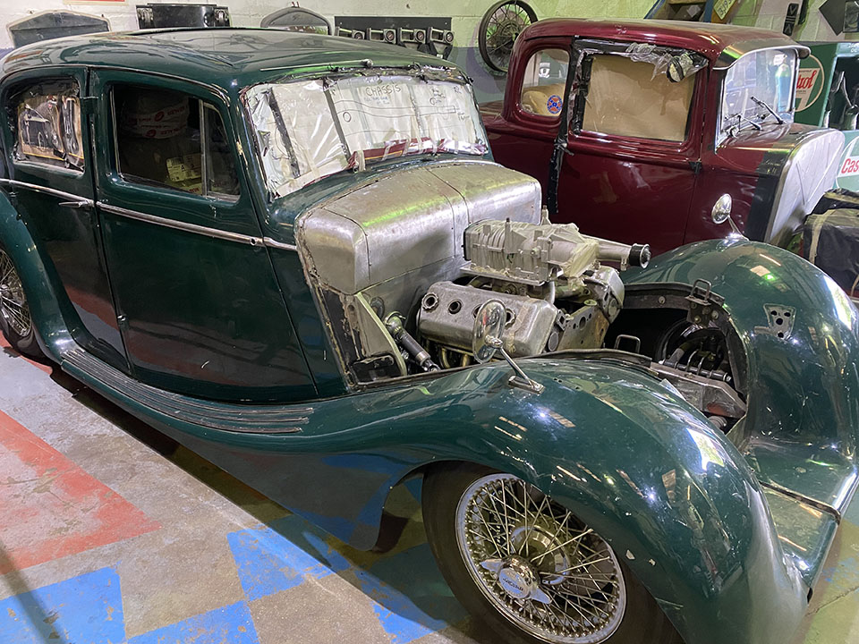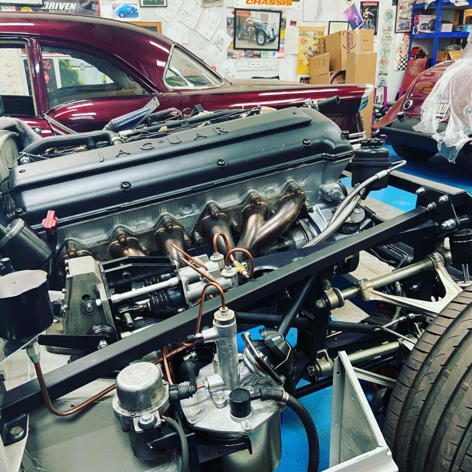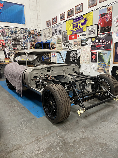 We’re especially excited about this build. This Jaguar MK4 has a custom-built IFS and an E-Type Jag IRS, and sits on E-Type wire wheels with the nostalgic knock-off centres. The car will also sit much lower than standard, with large 14″ custom-made brakes and a Daimler V8 built by the legendary Russ Carpenter.