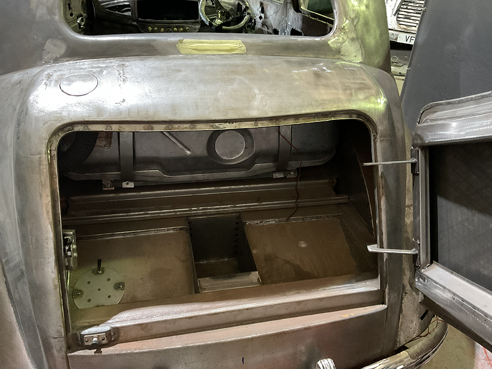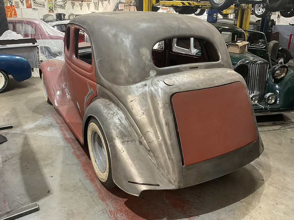 cool modifications, such as pillarless doors, a side-mounted rear boot, a flush-fit fuel filler, and smoothed-out running boards. The bonnet has been shortened and nipped in too. The front wings and rear arches have been reshaped, with the rear arches now flared at the back. The rear bumper has had a lot of work, including the exhaust exiting through the overriders. Also on the outside, you will notice the trick grille shell, which will have pop-out headlights. When you get inside this car, the modifications do not stop there! There is also a custom dash and centre console, as well as all-new floor pans.