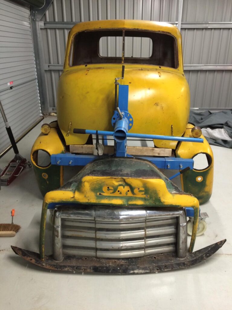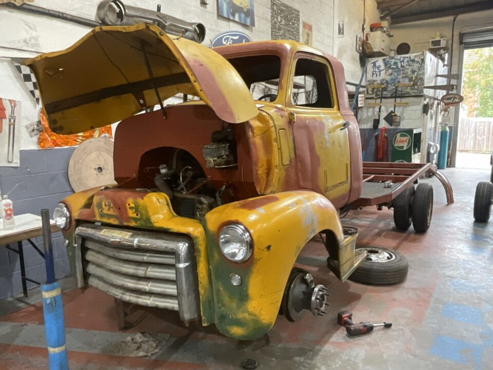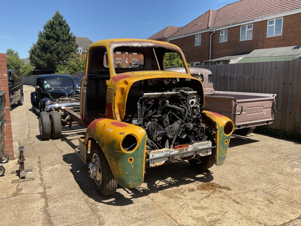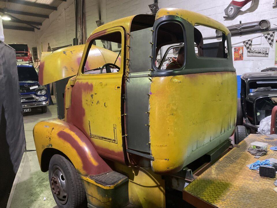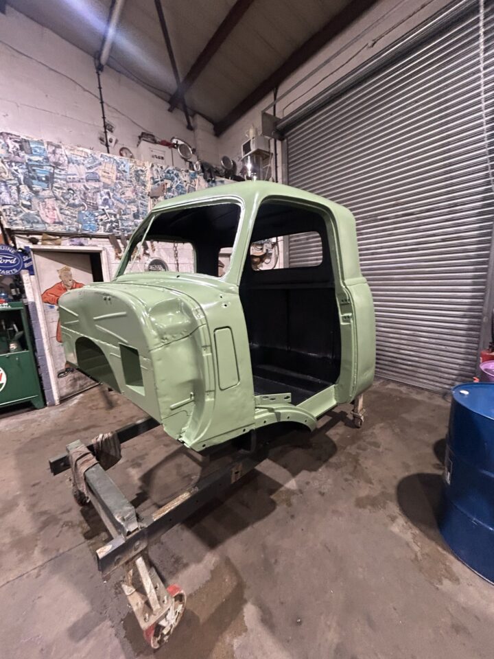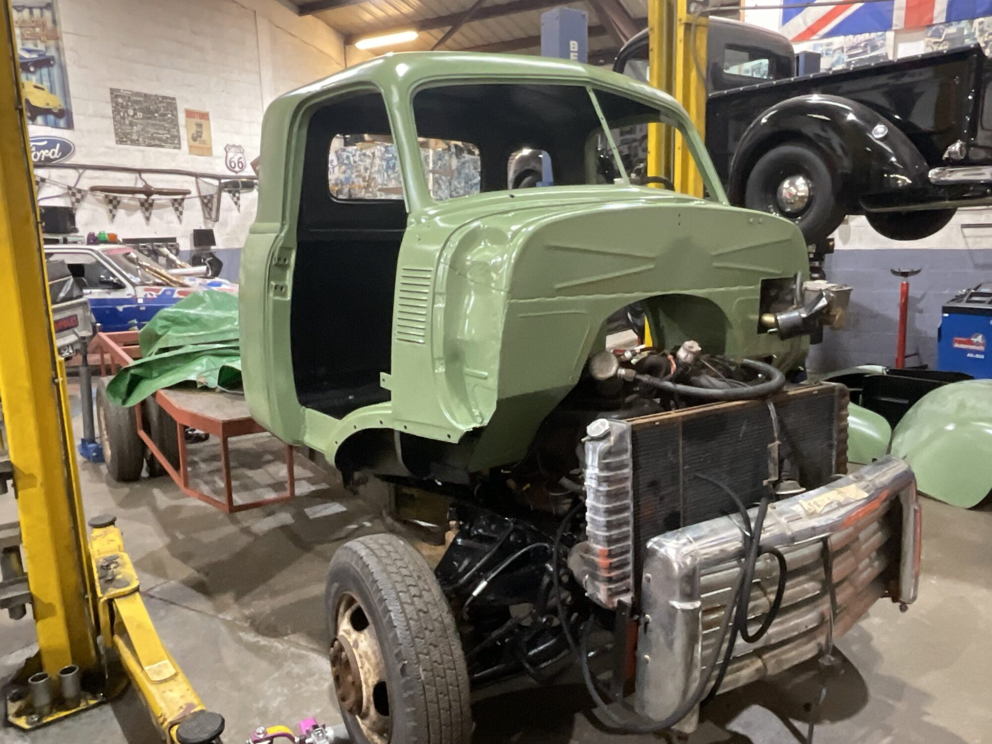 We have extended the cab, got the GMC diesel engine running, built the chassis extension, and had the cab and fenders painted in a vintage green shade. We are now working on getting the brakes braking, the steering to steer and getting the cab weatherproof for the customer to have back to finish.