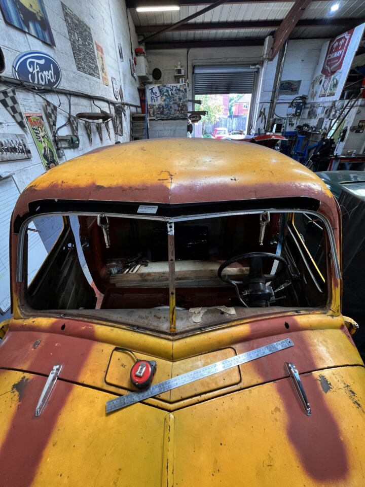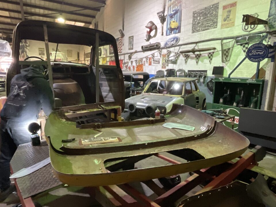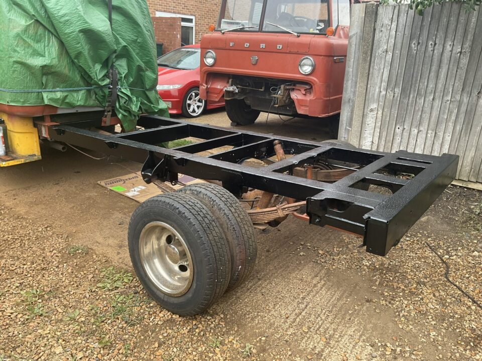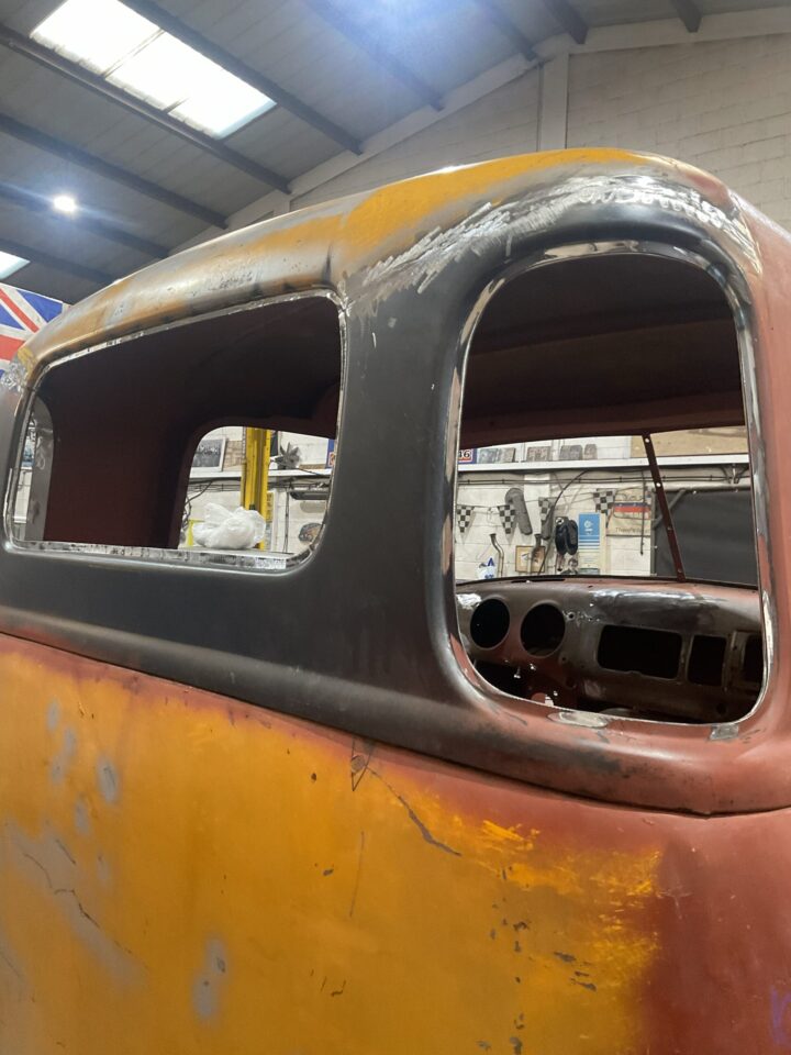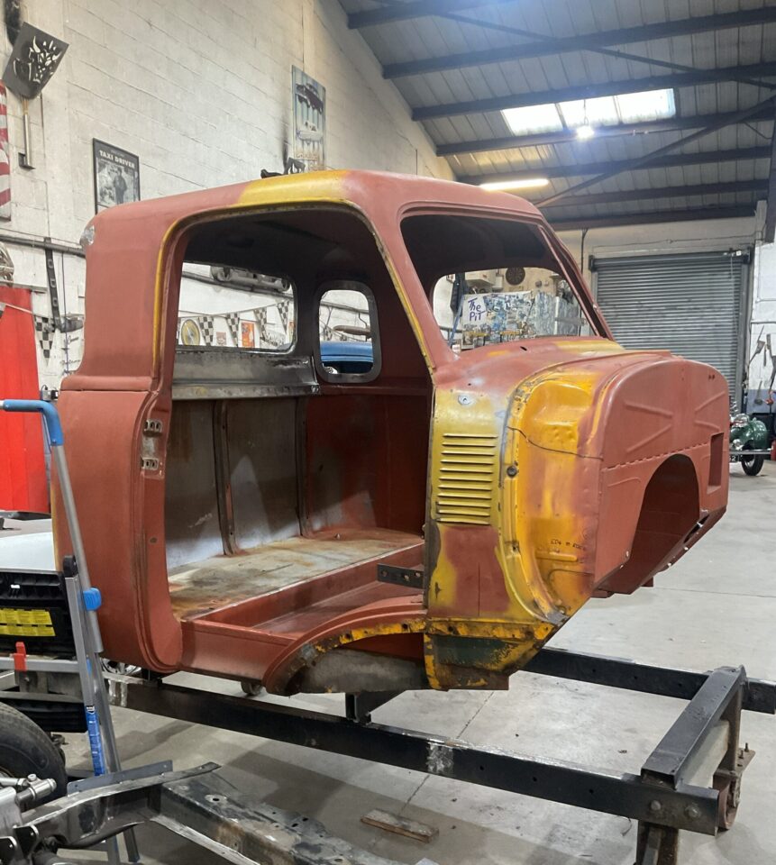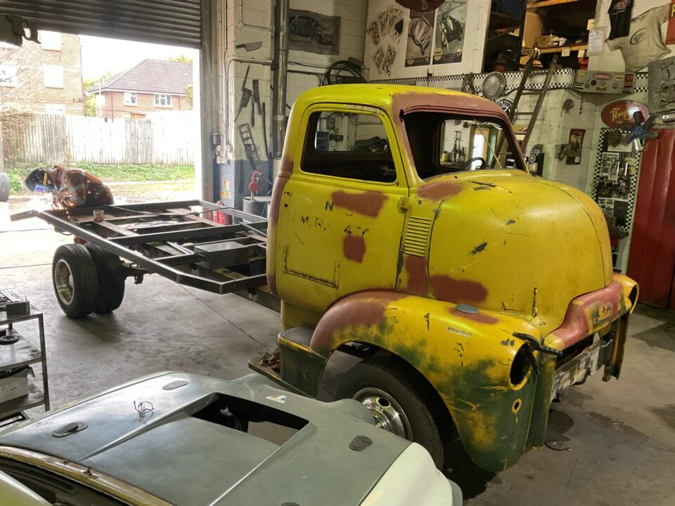 We have extended the cab, got the GMC diesel engine running, built the chassis extension, and had the cab and fenders painted in a vintage green shade. We are now working on getting the brakes braking, the steering to steer and getting the cab weatherproof for the customer to have back to finish.