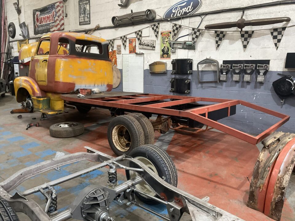 This GMC chassis build started with the cab from a 1947 GMC COE in need of TLC and the chassis from an ’80s GMC campervan dually. The customer has requested that the cab be extended and a beavertail be added so he can transport his Ferrari Cup race car.